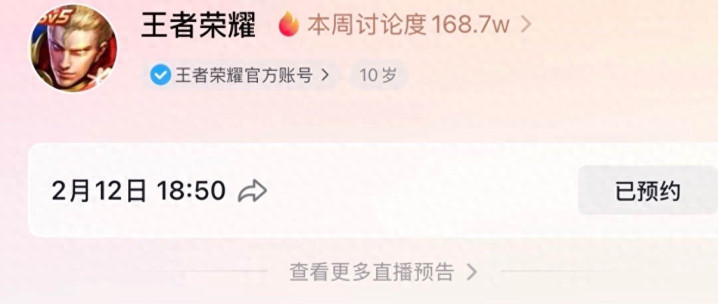 距离春节越来越近,每年春节期间,王者荣耀都会推出很多的活动。就在近期,王者荣耀已经开启了春节活动直播的预约,如下图所示,在2月12号,王者荣耀就会开启春节版本的直播。