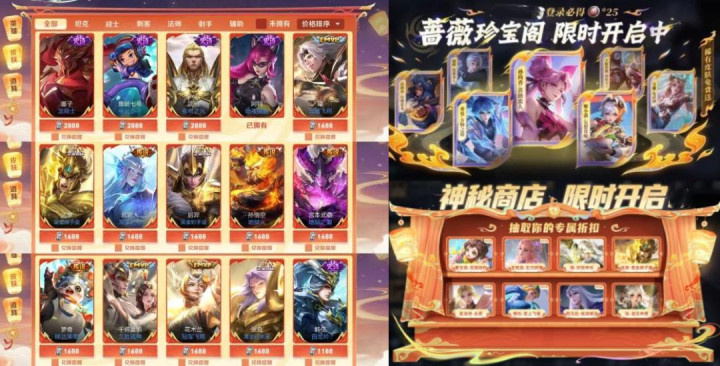 在春节期间,有四大商店活动会上线,一个珍宝阁商店,每年春节期间都会开启蔷薇珍宝阁活动,玩家可以获得一定数量的蔷薇之心,凑齐足够的蔷薇之心,就可以在珍宝阁商店兑换一款永久皮肤。
