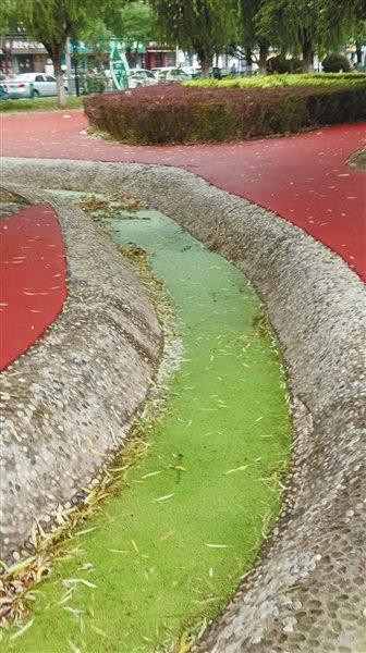 记者发现,喷泉虽然不喷了,但是铁箅子下的开放管道内依然有水,还有食品包装袋、一次性纸杯等杂物。广场一侧有一道明渠,里面也积存了不少树叶和枯枝。