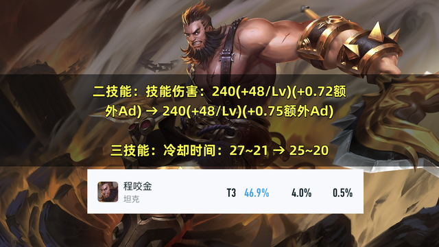 程咬金(加强):二技能额外ad加成提高3%,大招冷却时间从27~21秒,改为25~20秒,小幅度提升了对线期的伤害能力和续航能力,弥补了部分因装备削弱造成的清线速度下滑的问题。