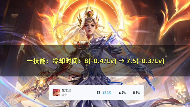 花木兰(加强):一技能冷却时间从8~6秒,改为7.5~6秒,小幅度提升了前期清线速度和连招频率,弥补了部分因装备削弱造成的损失。