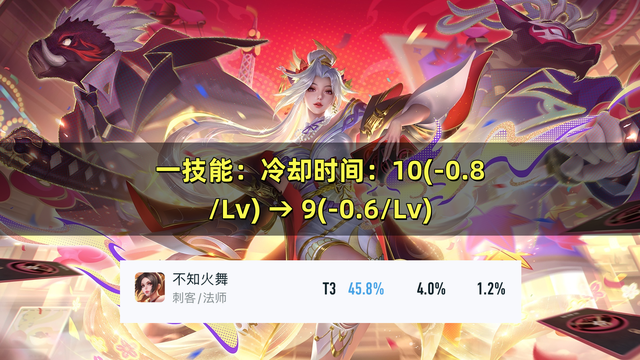 不知火舞(加强):一技能冷却时间从10~6秒,改为9~6秒,前期小幅度加强,后期强度不变。