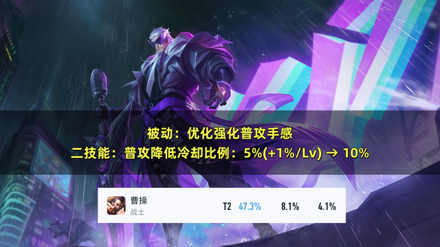 曹操(加强):被动优化了强化普攻的手感,二技能普攻降低的冷却比例固定改为了10%,解决了连招卡顿问题,前期剑气叠加速度加快,爆发力小幅度提升。