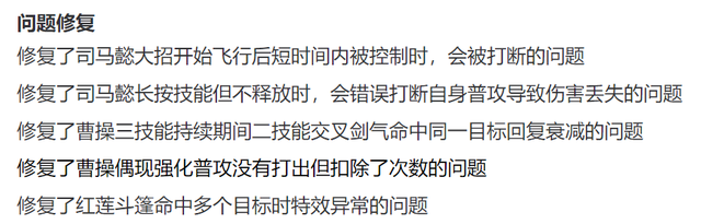 其中,修复了司马懿飞行后被打断的问题,以及长按技能会打断自身普攻的问题。修复了曹操三技能持续期间二技能交叉剑气命中同一目标回血衰减的问题,还有强普没有打出但扣除次数的问题。