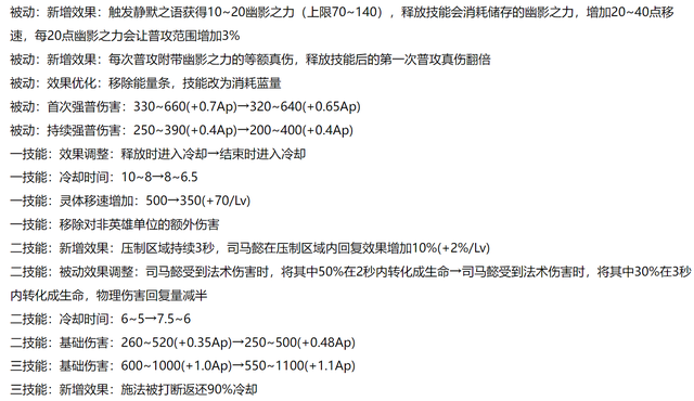 被动:伤害小幅度降低,能量条改为蓝条;新增幽影之力,释放技能会增加20~40点移速,每20点幽影之力会让普攻范围增加3%,最高增加21%,每次普攻附带幽影之力的等额真伤,释放技能后第一次普攻真伤翻倍。