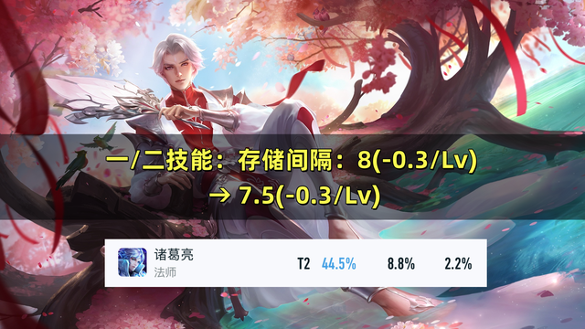 诸葛亮(加强):一二技能储存间隔降低从8~6.5秒,改为7.5~6秒,提高了技能释放频率和灵活性,间接加强了诸葛亮全时期的作战能力。