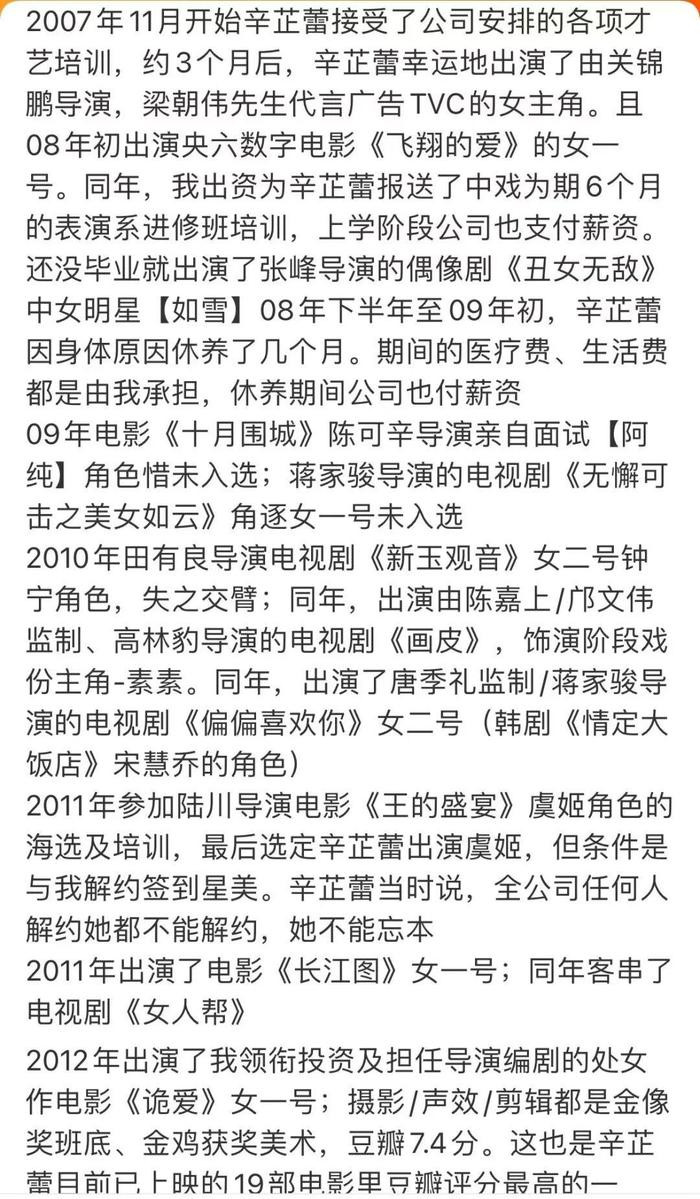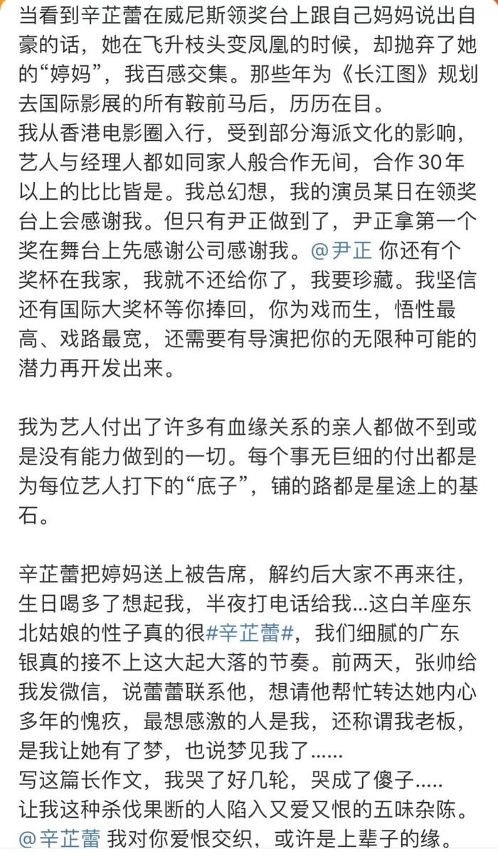 在梁婷发布长文后,辛芷蕾也发布了长文,正式感谢了“我入行的第一个经纪人梁婷女士”,辛芷蕾说,刚入行时梁婷跟她说过,“有一天你一定会成为国际巨星,这句话也是我最初梦想的来源。”