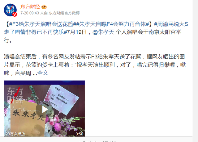 在朱孝天南京演唱会当天,其他F3成员又送来了大花篮,力挺朱孝天。这件事还登上了热搜,让不少网友感慨这四位成员的感情深厚。