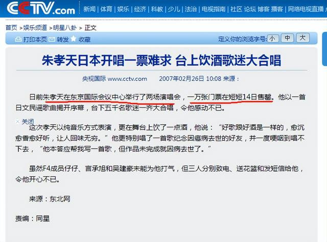 尤其是四人里的朱孝天,在唱歌这块还挺有实力的。不靠F4的名头,单以个人名义就在日本连开了4年演唱会,场场都坐满了人,一万张门票14天就卖光了。