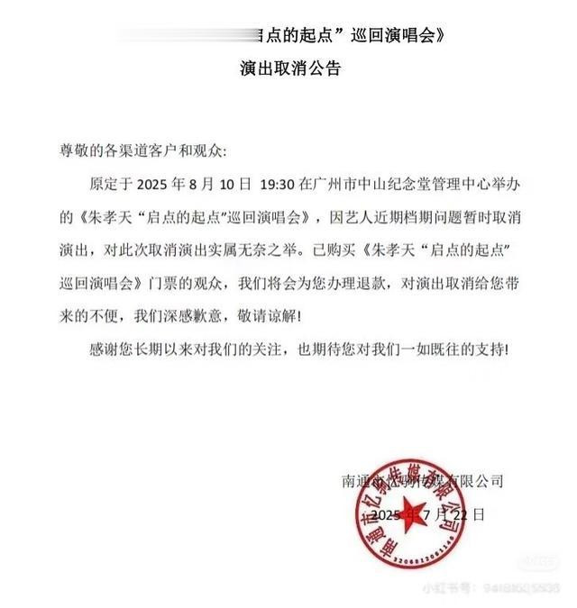 而且更惨的是,就在7月22日,公司宣布取消朱孝天下一站广州的演唱会,给出的理由是“艺人档期”原因。