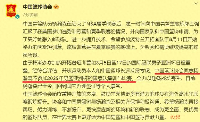 北京时间7月24日下午5点11分,中国篮协正式对外官宣,由于加盟开拓者队的杨瀚森希望参加开拓队于8月11日举办的两期短训营进一步提升自己的技术,而刚好又与男篮亚洲杯的赛程重叠,所以经过综合考量,决定不让他参加亚洲杯的比赛。