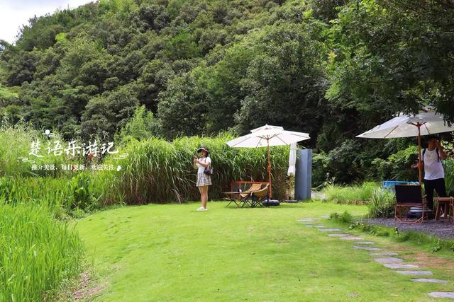 钱湖秘境的荷花大致有三部分。第一部分就是钱湖秘境入口处的荷塘,它的四周都是芦苇,中心是密集的荷叶和荷花,有野生的感觉。荷塘的西边是一片草坪,现在被打造成茶咖空间,游客可以坐在房前草坪上的露天茶座前品茶观荷。
