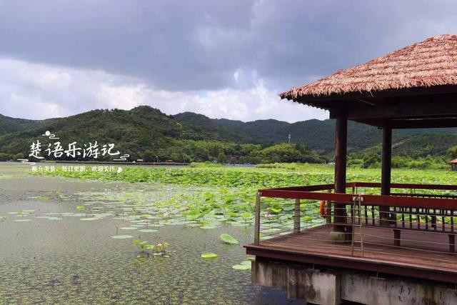 沿着挂画亭旁边的栈道往西走,再转过一道弯,可以到达西边的荷塘。这里的荷叶更加密集,荷花更加红艳,荷塘的东侧是宽阔的湖面,湖水之后就是连绵的青山。荷塘的西侧也有几座凉亭,另外还有几幢青砖黛瓦的房子。