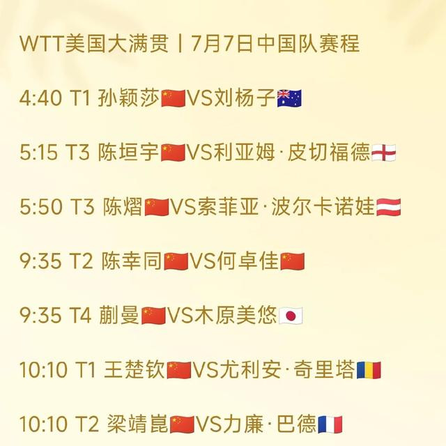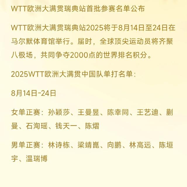 北京时间7月6日世界乒联公布WTT欧洲大满贯瑞典站首批参赛名单,国乒单打参赛15人,无王楚钦。在7月7日凌晨4点40分,也就是拉斯维加斯13点40分,国乒8人出席7场比赛,孙颖莎将迎来国乒的第一场比赛,王楚钦和梁靖崑压场,一早一晚。7月8日的赛程更新,王曼昱第一场,林高远压场。