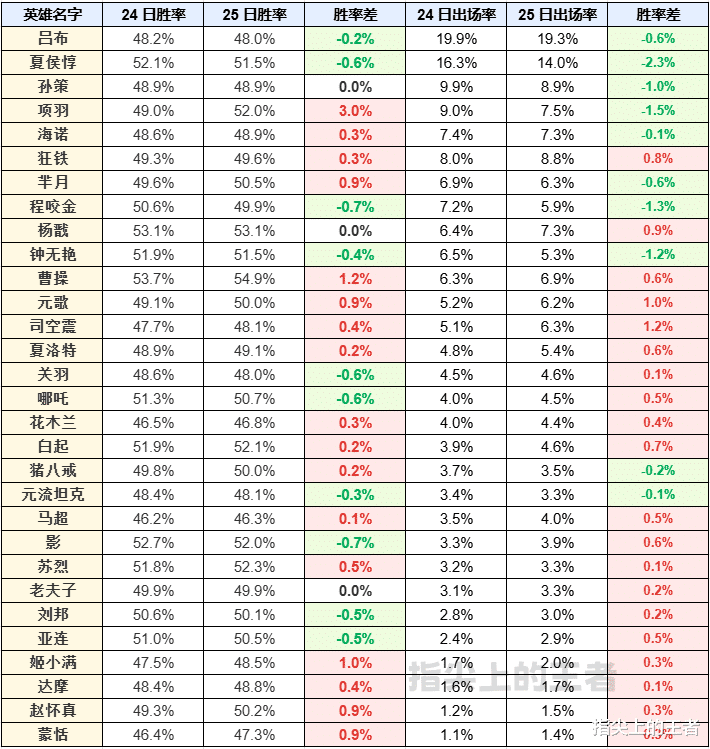 首先要明确的是,目前只有全分段的数据,24日,也就是上赛季末期是低分段的数据为主,而25日的版本前期,增加了大量的巅峰赛大佬,因为巅峰赛26日才开,所以一定程度上会影响英雄的数据。