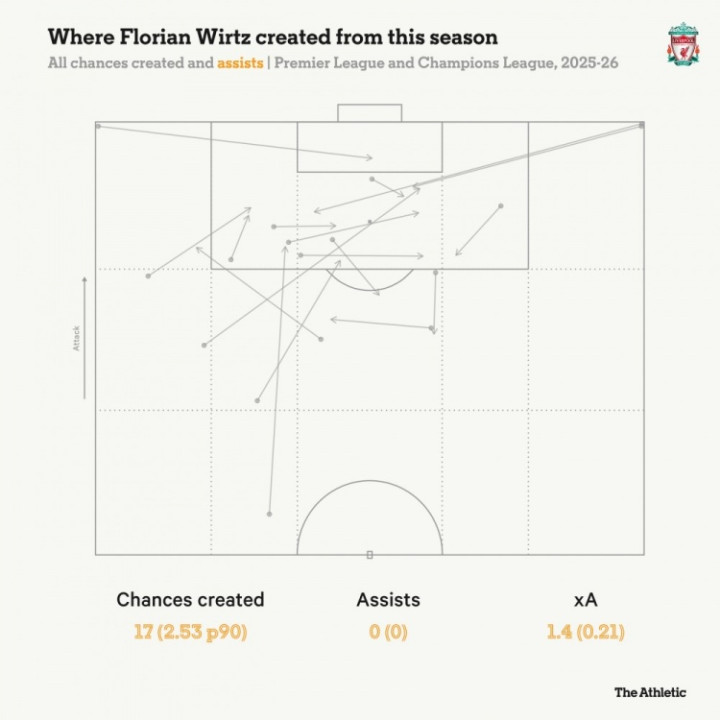 他在英超和欧冠中创造的17次机会,累计预期助攻值只有1.4——这其实说明,他并没有创造出太多真正有威胁的机会。