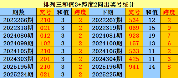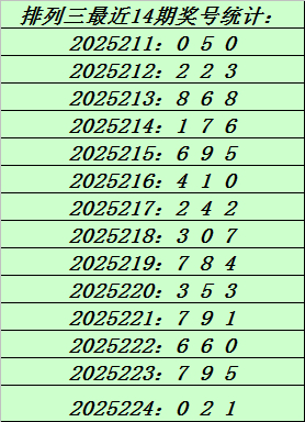 上期回顾:排列三第2025224期奖号:021。和值3,跨度2。