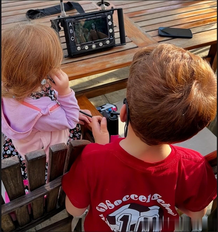 阿奇王子和妹妹莉莉贝公主在一起,观看着镜头里妈妈梅根的模样。外界关心的两个混血娃肤色和发色,可以说哈里的基因占据了高峰,阿奇和莉莉贝都是冷白皮,发色也都是家族遗传的姜汁红发。