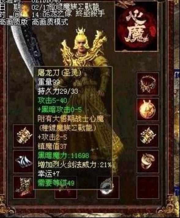 而真正将高下限武器推至顶峰的是被誉为“四大神器之首”的赤明天帝。其攻击属性高达22-28,下限甚至超越雷霆怒斩的上限,被玩家戏称为“最稳的老狗”。其核心魅力还来自于公认的隐藏属性——大幅增强烈火剑法的伤害,甚至可触发双倍效果。这一特性使其在与高幸运屠龙刀的对比中毫不逊色,因屠龙刀虽理论上限更高,但依赖烈火技能打爆发时,赤明天帝的稳定性与特化加成反而更胜一筹。正因如此,赤明天帝在巅峰时期的市场热度与认可度一度超越屠龙,成为许多顶级战士在团战与高端PK中的首选利器,其地位直至今日仍被老玩家津津乐道。