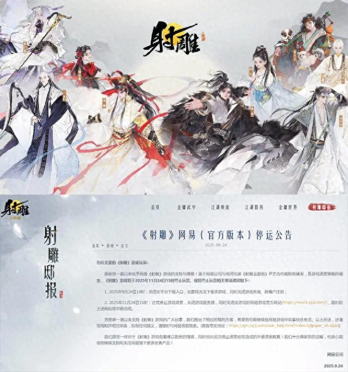 近日,网易旗下游戏《射雕》突然宣布,由于与IP授权合作即将结束,加上基于游戏运营策略的调整,决定于2025年11月24日停止运营。